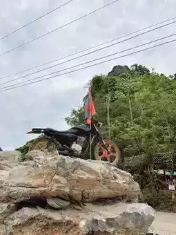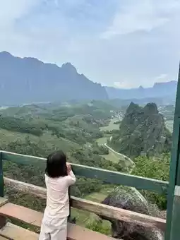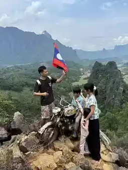 从帕南赛山俯瞰万荣市的景色,美不胜收。平原与巍峨群山交替出现,处处绿意盎然,生机勃勃。山顶上停着一辆插着老挝国旗的摩托车,我们可以站在上面挥舞国旗拍照,感觉很棒。想要拍到