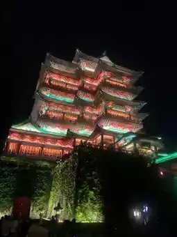 千年古塔!塔身悬挂着风铃,随风摇曳,叮当作响。附近有一条美食街,可以轻松品尝到各种水煮和油炸小吃。夜晚的灯光营造出浓郁的氛围🏮