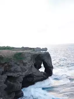 站在悬崖上,俯瞰着海浪和象鼻岩,冲绳的蓝色令人着迷。