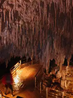 进入洞穴后,我们看到了壮观的钟乳石和地下水;洞内温度凉爽而神秘。