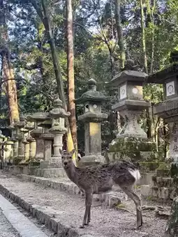 春日大社毗邻奈良公园,是奈良最重要的旅游景点之一。神社内3000座石灯笼和漫步的鹿群是游客们喜爱的拍照地点。春日大社的神鹿传说源于武御雷命,据说他骑着一头白鹿来到奈良。如今,春日大社后腿毛呈白色的鹿被认为是这些神鹿的后裔。📍