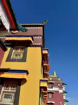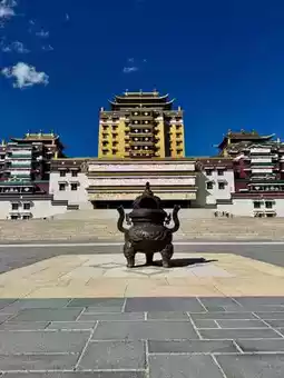 沿着悬铃山步道而行,八座高耸的白色佛塔如同守护神一般,迎接来访者。主殿法西院高达80余米,融合了汉藏建筑风格,金色的屋顶在高原阳光的照耀下熠熠生辉,散发着神圣的光辉。作为中国最大的佛殿,法西院内供奉着吉尼斯世界纪录认证的“中国最高的弥勒佛像”(37米)。佛像慈悲地俯视着来来往往的众生。