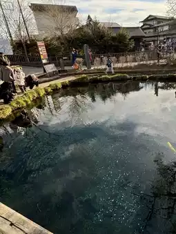 八个清澈见底的泉水池,由富士山的雪水过滤而成,倒映着群山和村落的景色。池水与中式建筑和灯笼点缀的小径交相辉映,仿佛让人穿越回了过去。在这里,旅人们总是轻声细语,自然而然地放慢脚步,让人得以静静欣赏大自然的美景。
