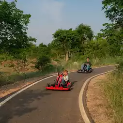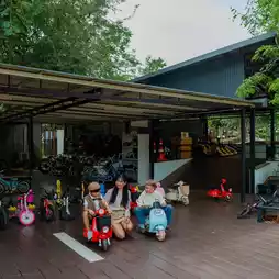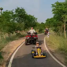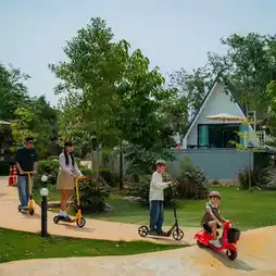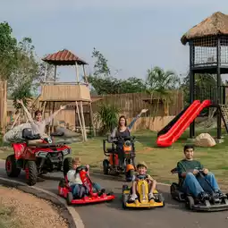比以前更大的游乐区,里面有各种各样的游乐设施,包括卡丁车、沙滩车、滑板车、自行车、滑板、儿童俱乐部、射箭、飞镖、沙坑、滑索和攀爬滑梯,孩子们