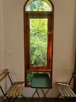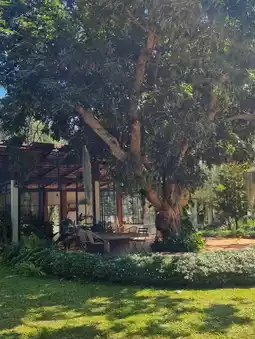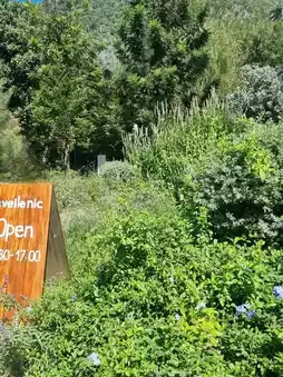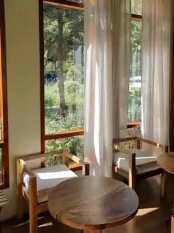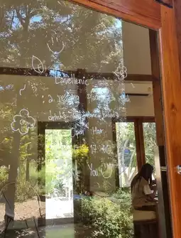 氛围:一家可爱简约的咖啡馆,四周绿树环绕,鲜花盛开,还有一个小花园。咖啡馆本身是一栋小巧的单层白色长方形房屋,四周环绕着大窗户。从停车场到入口,有一条穿过绿树鲜花花园的小路。这里环境清幽,绿荫蔽日。咖啡馆提供室内和室外座位。室内以浅色调装饰,木质家具与白色墙壁和玻璃形成鲜明对比。自然光线倾泻而入,营造出开阔明亮的氛围。室外座位区位于一棵巨大的榕树下,周围环绕着树木和鲜花,蝴蝶翩翩飞舞。部分角落可以欣赏到山景,营造出真正的自然风光。这里有很多拍照的好地方。咖啡馆提供各种饮品和蛋糕,每一样都美味可口。商店旁边的停车场空间宽敞,可停放多辆汽车。