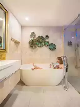 可以欣赏海景的私人阳台。浴室里有浴缸,可以尽情泡澡。🛁