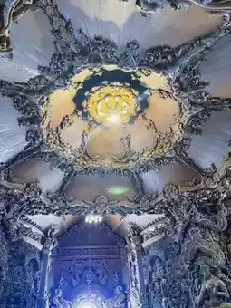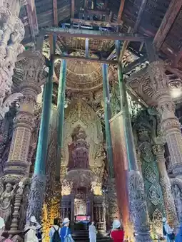 这个地方最引人注目的地方在于,整座建筑完全由木头建造,没有使用一颗钉子,而是通过榫卯结构连接,形成一片仿佛无穷无尽的雕刻海洋。每一面墙壁、每一根横梁上都镌刻着东西方宗教和哲学的故事,从印度教的梵天和象头神到佛教的观音菩萨,以及太阳、月亮、星星和宇宙万物的象征符号。每一个细节都如此引人入胜,让人忍不住驻足凝视。