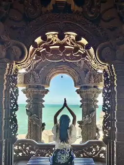 主殿正门是芭堤雅必拍的景点,正门面向大海,日落时分在这里拍照美不胜收!寺庙内部巨大的木雕柱子、精美的天花板以及主殿内的神像都是绝佳的拍照背景。寺庙外有一条海滨步道,沿着步道走一小段,可以欣赏到大海和寺庙的全景。
