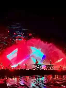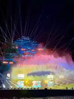 夜晚的灯光秀营造出九里市独有的浪漫氛围🔥。文化广场燃起篝火,您可以与苗族男女一起感受热闹的氛围~。