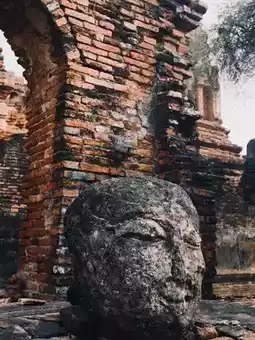 这尊佛头曾是寺庙佛塔的一部分,但在战乱中坠落。数十年或数百年后,大自然将其滋养并安放在树根之中,成就了今日这令人动容的景象。