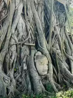 一尊佛头被菩提树的根系紧紧环抱,嵌在树干与泥土之间,宛如大自然精心雕琢的杰作。佛像双目微闭,面容安详,微微一笑,仿佛在说:“一切都过去了。”