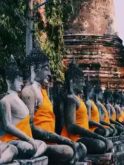 据说这座巨大的白色佛塔建于缅甸统治时期。拾级而上,耳畔传来阵阵微风,脚下便是阿瑜陀耶肥沃的平原。远处群山点缀,寺庙尖顶林立,营造出一片宁静祥和的景象。