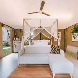 这次我入住的是一间单卧室泻湖泳池帐篷,每个细节都设计得非常精美。这片区域非常宽敞。帐篷前有一个私人泳池和一个秋千,可以让你整天坐着放松。房间设施齐全,特大号床柔软舒适。床尾配有沙发、办公桌和空调,白天也不会觉得热。浴室干湿区域划分得非常合理,就像在一家标准的五星级酒店一样。洗漱用品一应俱全,我很喜欢洗漱用品的香味,尤其是润肤露,让人忍不住想在家也用。