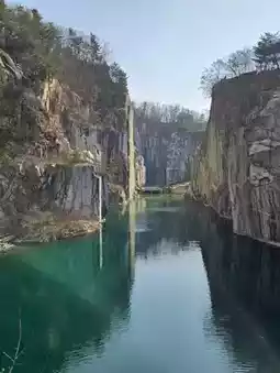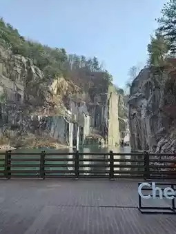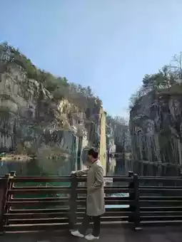 清澈的天州湖湖水与壮丽的垂直峭壁交相辉映,