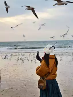 在站桥海滩喂了海鸥。中午