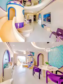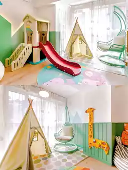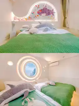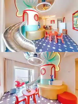 从民宿打车到五四广场很近,起步价也差不多,步行10分钟就能到海边。我们选的家庭房简直让我惊喜——房间里居然有滑梯和球池!晚上孩子们玩得不亦乐乎,直到筋疲力尽,我这个累坏了的妈妈终于可以躺下来好好看看剧了(太感动了)。房间里配备了全套婴儿消毒器、暖奶器,甚至还有儿童马桶座圈。这种贴心程度简直堪比哆啦A梦的口袋!