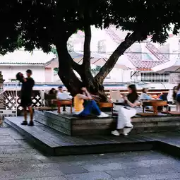 右边有一棵非常高大茂盛的大树,树下有很多座位,一只懒洋洋的狗狗正躺在树下。