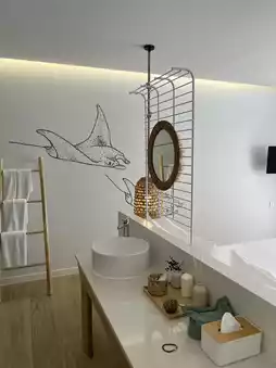 这家位于罗勇府的海滨度假村真是太棒了!💕💕 这家度假村氛围超赞,安静又绿树成荫。从度假村对面的海滩就能听到海浪声。这里是放松度假的完美之选。度假村的装饰简约,设施齐全。大型游泳池是孩子们的天堂,设有儿童泳池、丛林戏水区、水上乐园和适合幼儿及大龄儿童的游乐室。💦👶🏻 度假村提供多种房型选择。无论您是独自旅行、情侣出行、与朋友结伴还是携家带口,都能找到合适的房间。我们入住的是带浴缸的豪华房。🛀 房间很漂亮,充满了巴厘岛的木质风情。床很大,还配备了吹风机。而且房价包含自助早餐,非常划算。