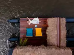 住宿是一座漂浮在水面上的木屋,氛围超棒。清晨醒来,可以看到雾气在河面上飘荡。身后是青山环绕,宛如电影场景。傍晚的景色同样壮丽,日落美得令人窒息。你可以在这里放松一整天。🏞️
