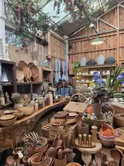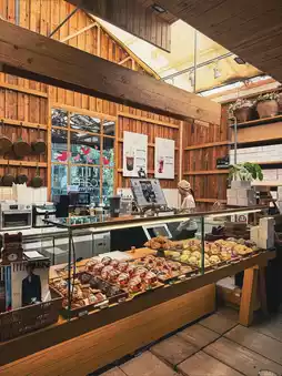 • 咖啡馆采用“谷仓复古/欧式乡村”风格装饰,半透明的屋顶和木质托盘墙面,让室内充满自然光线。