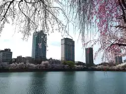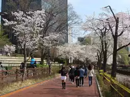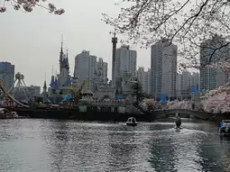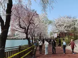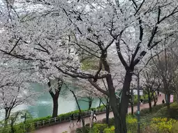 首尔蚕室石村湖是首尔最受欢迎的赏樱胜地之一,以其都市天际线与自然美景的完美融合而闻名。石村湖分为东西两部分,四周环绕着樱花树,每年四月初至四月中旬盛开。