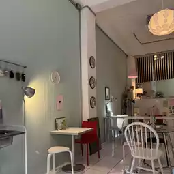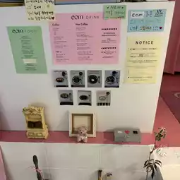 Cafe eom (이오엠) 的室内装潢和配饰可爱,营造出杂货店的氛围。
