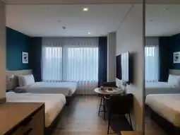 房间靠窗有一个可以坐的窗台。桌子很宽敞,配有两把椅子。酒店1楼有一家星巴克,只提供外带服务,而且关门很早。不过,步行2分钟即可到达另一家星巴克。