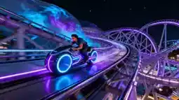 3. 创极速光轮:骑上光轮摩托车,在未来感十足的赛道上体验极速与科幻的刺激。夜间的第二次体验灯光璀璨,更加炫目,但晕车者需谨慎。