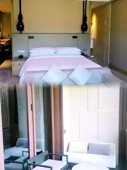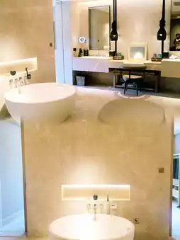 步入酒店大堂,设计巧妙融合了“福林水韵”与现代美学:高耸的拱形天花板下,古老建筑的飞檐化作金属艺术装置,光影交错,宛如流水;墙面镶嵌着仿照广福林遗址出土文物制作的陶土图案,每一处细节都诉说着古老的故事。客房内,落地窗将遗址或花园的景色尽收眼底。定制的“水波纹”地毯和饰有松江文化元素的装饰画营造出与历史对话的私密空间;浴室配备高级洗浴用品和独立浴缸,最大限度地提升舒适度,缓解旅途疲劳。