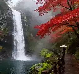 - 漫步于悬崖栈道,两侧古树红叶交相辉映,与灰白岩壁形成鲜明对比