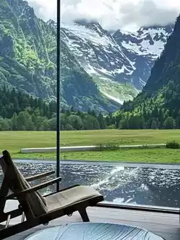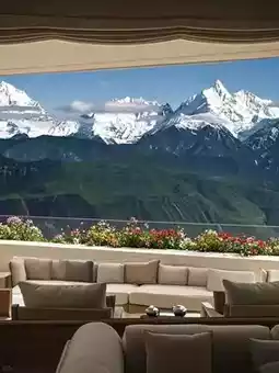 🔸 公共区域拥有360°全景落地窗👀,将阳光照耀下的金色雪山美景尽收眼底。这家酒店的侘寂风格非常迷人,和孩子们一起拍照超级有型~