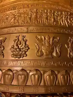 它是世界第二大转经筒,高约21米,通体镀金。转经筒重达惊人的6万公斤,通常需要至少六到八个人共同协作才能顺时针转动。转经筒上