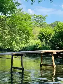 木桥充满了古韵!它横跨一条潺潺流淌、水质清澈的小溪。孩子们站在桥上可以看到小鱼游来游去,非常适合拍照——每一张照片都像一张经典的古风全家福~