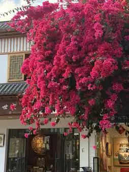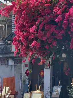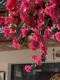 它们攀附在墙壁上,垂挂在屋檐下,与村庄的艺术氛围完美融合。每一朵三角梅都仿佛是大自然精心绘制的油画,既鲜艳又雅致。阳光倾泻而下,花瓣闪烁着光芒,吸引着人们驻足拍照。