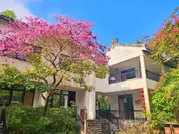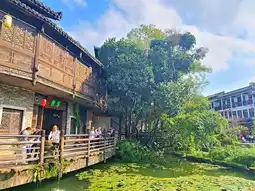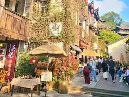 凤凰客家饭店是甘坑古镇一家充满客家风情的酒店,酒店前的樱花林更是美得令人陶醉。樱花树整齐排列,粉白相间的花瓣如浪漫的樱花雨般缓缓飘落。站在樱花树下抬头仰望,映入眼帘的是一片粉色的花海,与古镇的传统建筑交相辉映,仿佛穿越回了古代诗意的画卷之中。