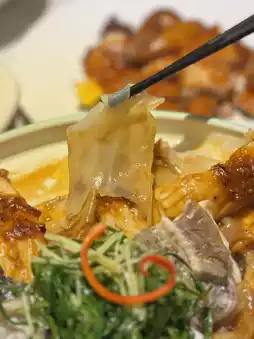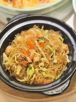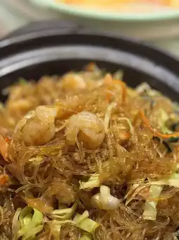 ,虾仁爆炒至虾油溢出,粉丝吸收了虾汁和蒜香,干爽弹牙,上桌时滋滋作响,香气扑鼻,最后还有一层脆皮锅巴,美味至极