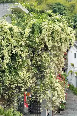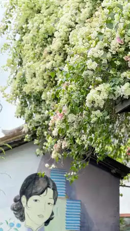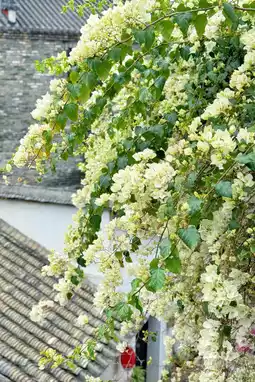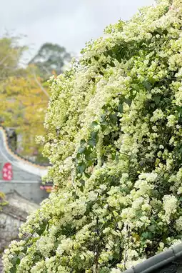 从南门右侧的小门进入,步行50米即可到达第一个拍照点,那里有一整栋建筑都被白色的三角梅覆盖(图3、10)。📷
