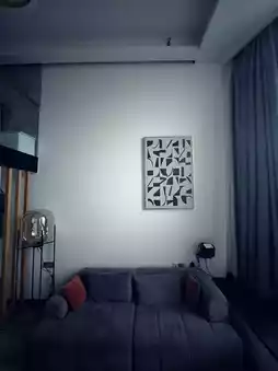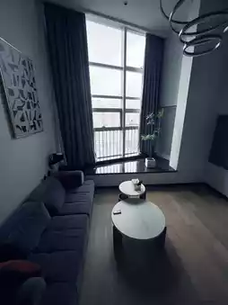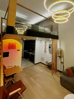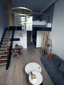 房间的起居室里有一台投影仪。楼上的卧室也是阁楼式的——你可以从上面看到起居室。整个房间都播放着音乐,所以你可以随时随地跳舞。