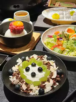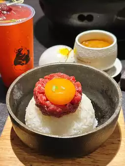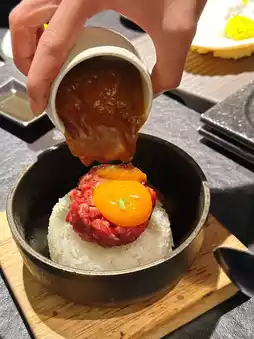 盛在石锅里,服务员将咖喱酱倒入石锅,然后拌入鸡蛋、和牛和米饭。