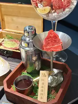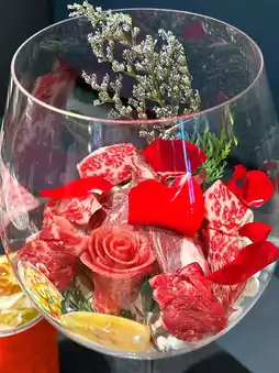 看到红酒杯的时候,我被它的精美程度惊艳到了。里面盛满了顶级牛肉,包括牛脑、牛舌和牛小排,牛舌还卷成了一朵玫瑰花,简直像一件艺术品。和牛的脂肪分布均匀,肉质非常新鲜嫩滑,炭烤风味浓郁。