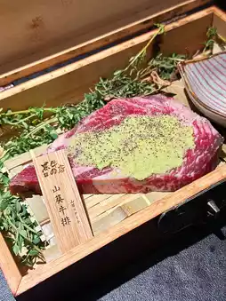 和牛上脑经过干式熟成,口感格外柔软。上面抹了很多芥末,肉里散发着浓郁的芥末香气,让人欲罢不能。