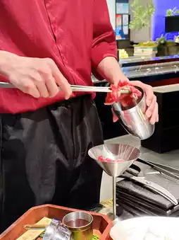 店员先把牛肋排和红酒放入摇酒器中,然后摇匀。