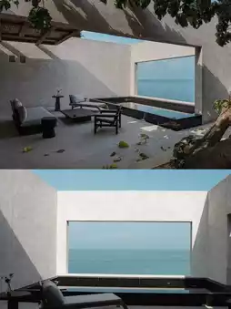 别墅的海景房和私人泳池,将整个南海的蔚蓝尽收眼底。庭院里的落叶飘落在藤椅上,芬芳与海浪的节奏交织。就连茶室的玻璃门也化作一幅画框,捕捉着浪尖的波光粼粼或暮色的斑驳。