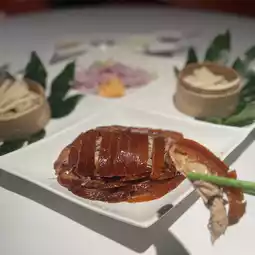 这道菜配有四种不同的酱汁,与烤鸭完美搭配。烤鸭皮脆肉嫩,口感绝佳,令人回味无穷!