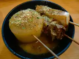 这家餐厅以静冈市的代表性美食“静冈关东煮”而闻名。静冈关东煮是大正时代在静冈市发展起来的一种独特的关东煮。它以浓郁的酱油和附近渔港出产的大量鱼糜熬制而成的黑色汤底,是当地特色美食。这种饮食文化代代相传,静冈市的街巷里遍布着关东煮专卖店。Nodaya餐厅忠实地遵循着静冈关东煮的传统,吧台前摆放着一口咕嘟咕嘟冒着热气的味噌关东煮锅。除了静冈关东煮的标志性食材——黑鱼饼和牛筋之外,这里还有味噌萝卜、猪肚等各种独特的食材可供选择,让人在点餐前就充满期待。独特的微焦风味浓缩了鱼肉的鲜美,搭配静冈引以为傲的各种当地清酒,更能尽享这绝妙组合。这家餐厅致力于推广静冈的饮食文化,除了关东煮之外,还充分利用当地食材,尤其是来自原骏河地区的食材,创作出诸如“金枪鱼丸丸沙拉”和“织户茄子味噌田乐”等原创菜肴。更令人惊喜的是,他们不仅供应静冈关东煮,还供应“关东关东煮”。受中京文化影响较大的静冈关东煮与关东关东煮并列为招牌菜,似乎也体现了静冈市作为东海与关东交汇点的独特魅力。交通:从新静冈站步行约15分钟