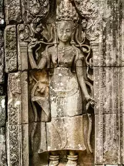 寺庙的塔楼上还雕刻着著名的吴哥神像。由于围绕着吴哥窟的城市吴哥城防御工事非常坚固,因此历代国王都没有像往常那样费心建立新的都城,所以吴哥窟有很多不同国王的扩建部分。