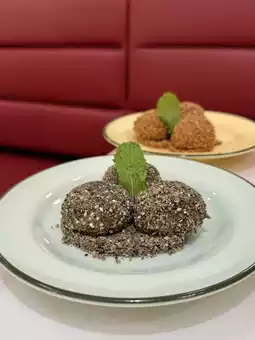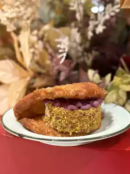 甜点方面,千万不要错过芋头冰淇淋包——炸馒头包裹着香浓的芋头冰淇淋、芋泥和香脆的开心果碎。这道菜口感丰富,令人满足,是完美的餐后甜点。