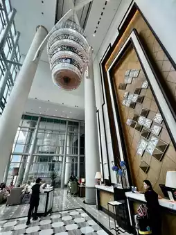穿过红灯笼码头,步入宾客登记大厅,映入眼帘的是一盏壮观的多层水晶吊灯,从高耸的天花板垂落,给人留下深刻的第一印象。酒店各处均设有落地窗,将滨海湾的迷人景色尽收眼底,而光洁的大理石地板则营造出无限延伸的空间感。