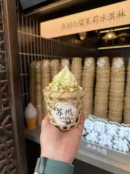 这道菜的摆盘简直太梦幻了。谁会想到用小竹篮装冰淇淋呢?很符合苏州的气质,太惊艳了!冰淇淋上的花朵居然是可以吃的!可以吃!可以吃!太有创意了!