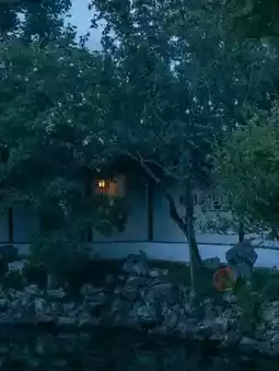 暖黄色的灯光勾勒出深色瓦片的轮廓,月光洒在粉色的墙壁上,波光粼粼。提着小灯笼漫步园中,光影在林荫道间翩翩起舞,宛如一幅流动的画卷,美不胜收!🎨